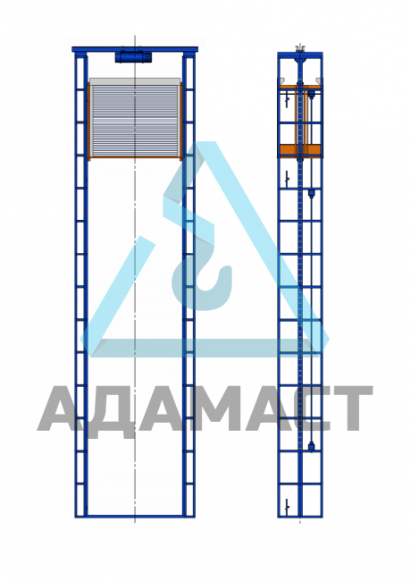 Двухмачтовый подъемник состоит из модульных секций, которые соединяются между собой сваркой, образуя две самонесущие мачты с направляющими, по которым движется грузовая клеть.