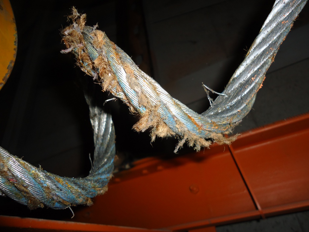 Природа повреждения: Запуск привода был осуществлён из ШУ принудительно, трос сначала полностью был смотан с барабана, потом намотан в обратную сторону (неправильная намотка могла быть осуществлена не один раз!), что привело к его повреждениям и перегибам.