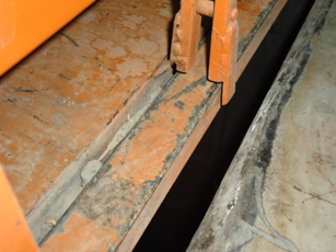 Природа повреждения: На полу клети паз нижних направляющих раздвижной решётки забит грязью и мусором, что приводит к её заклиниванию при открывании и повреждению ограничителей.