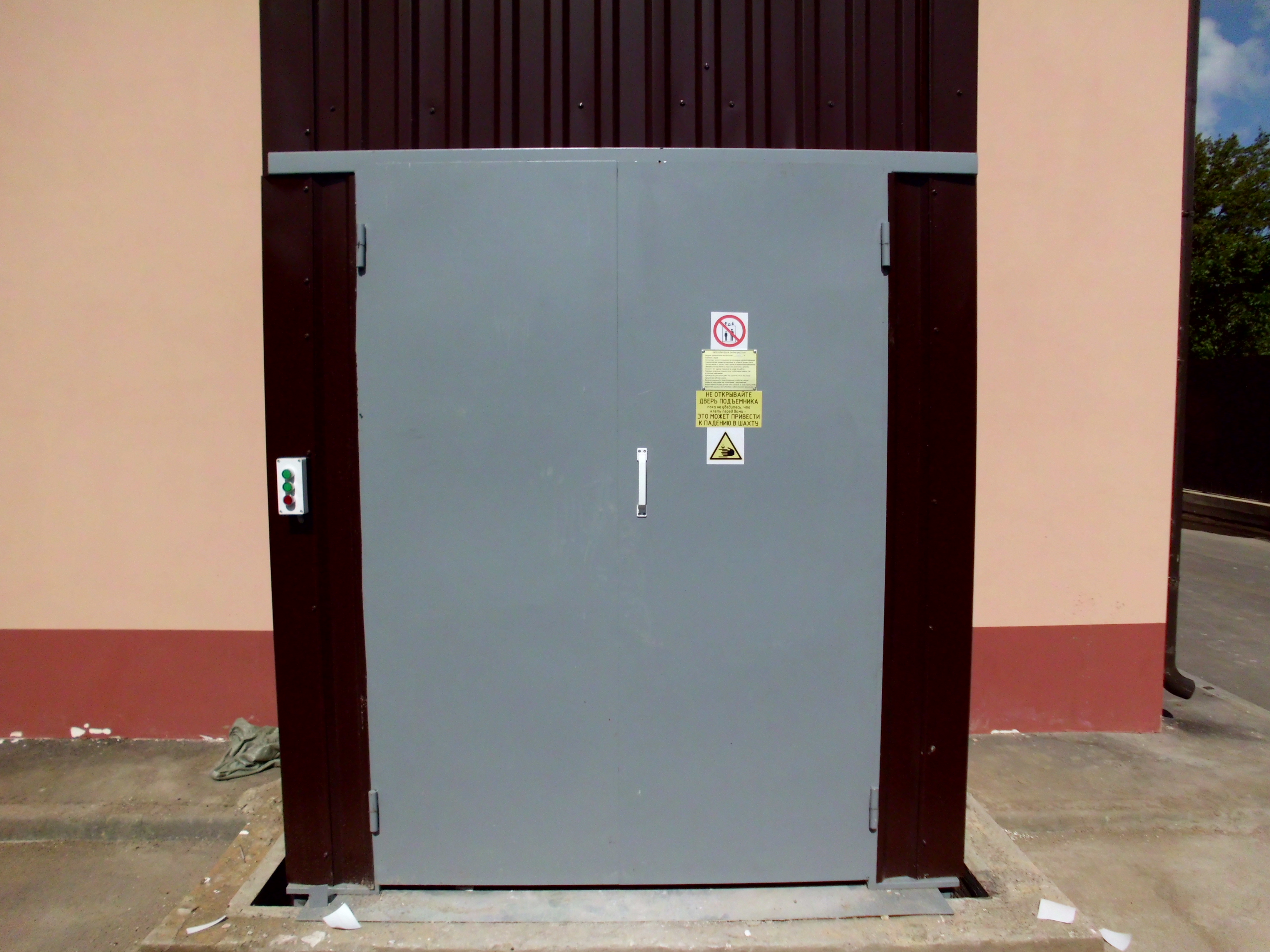 Данный шахтный подъемник обшит профлистом, оборудован ограничителем грузоподъемности и устройством подачи звукового сигнала при перегрузке. Подъемник расположен снаружи здания, дверь на втором этаже утеплена.