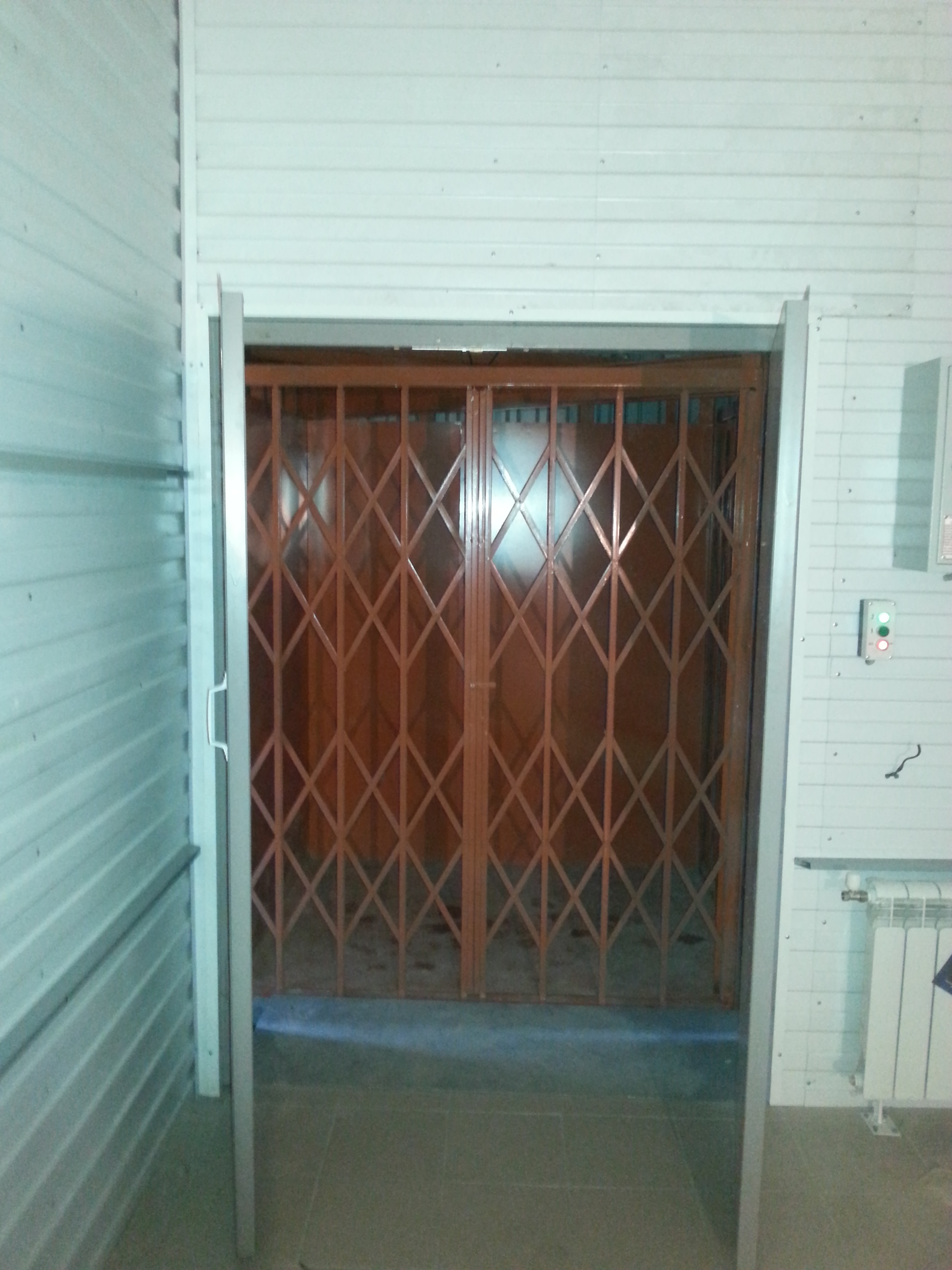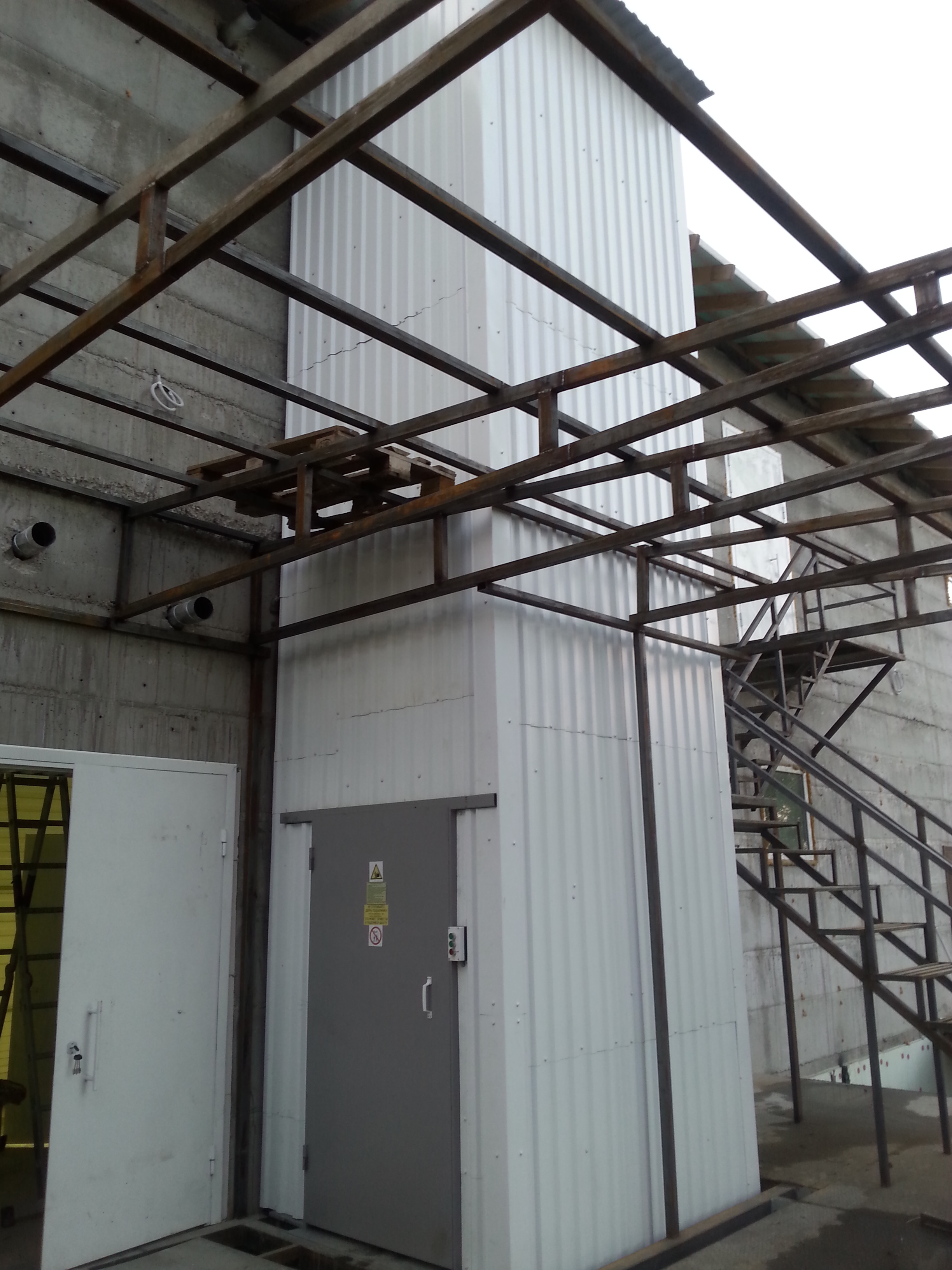 Данный шахтный подъемник обшит профлистом, расположен снаружи здания. Подъемник вписывали в уже существующую конструкцию.