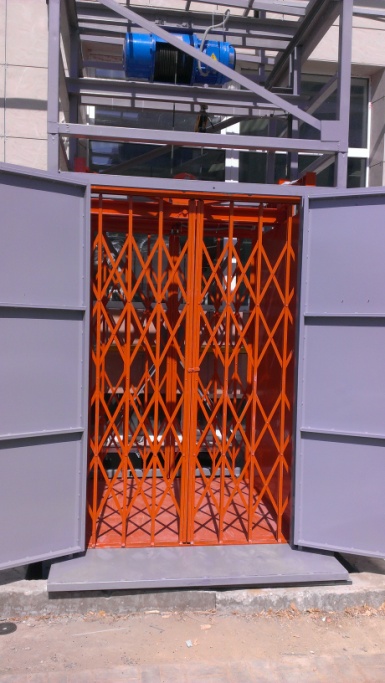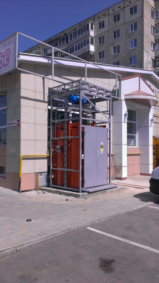 Несмотря на очень малые размеры приямка, наша организация смогла запроектировать, изготовить и установить грузовой подъемник на 1000 кг, на две остановки, одна из которых находится в подвальном помещении. При этом подъемник смонтирован так, что не загромождает ни загрузку, ни проход пешеходов по тротуару. Данный подъемник может быть обшит профлистом, для которого не обязательно конструировать отдельный каркас, а можно закрепить к самонесущей шахте грузоподъемного оборудования.